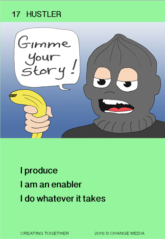 Hustler: I produce, enable and do whatever it takes to succeed. I extract goodness, coerce and hustle my way past any limits. I re-enchant the myth that the best stories come from the hardest places and I know how to commodify them.