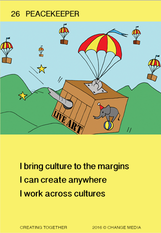 Peacekeeper: I bring culture to the void, I can work anywhere and across cultures. I bring my own team of experts to ensure it is a high quality collaboration. I provoke and stimulate them with spectacles. I demonstrate that there are endless possibilities. It will be awesome for them, and we provide an incentive for them to create their own events, when we leave.