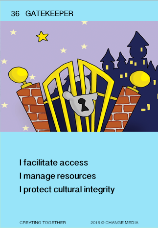 Gatekeeper: I facilitate access, manage resources and protect cultural integrity. This is an important role, and I will block access, control resources and exclude people to safeguard our precious cultures.