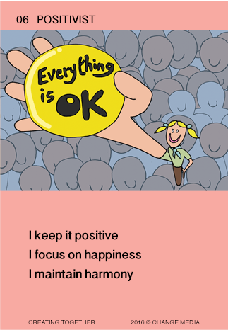 Positivist: I keep it that way - positive, happy and harmonic. What’s not to like? Never mind the censoring, the negating of emotions, or the disallowing of tensions. Positive minds attract - why can’t we all just get along?
